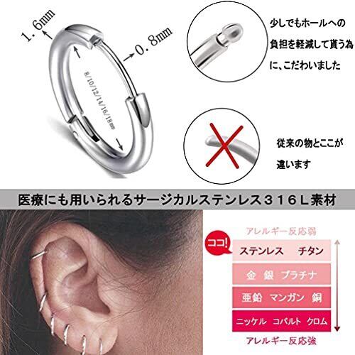【内容】フープピアス (10個セット) ポスト約16G 内径8mm 10mm 12mm 14mm 16mm (カラーバリエーション)シルバー、ブラック、ゴールドー、ローズゴールドー 【ノンアレルギー素材ステンレス316L】素材は医療などでも使用される316Lステンレススチールを使用しており、この素材は金属アレルギーが出にくい言われています。また汚れに強く、お手入れは布で軽い拭くだけで簡単にできます 【キャッチ不要でワンタッチ取付 】中折れ式のフープピアスはキャッチのないタイプですので、キャッチをなくす心配もありません。ポスト(針)が外に出ないので安心で引っかかりがなく、付け外しが簡単でピアスホールが痛みにくくすっきりしていておしゃれです