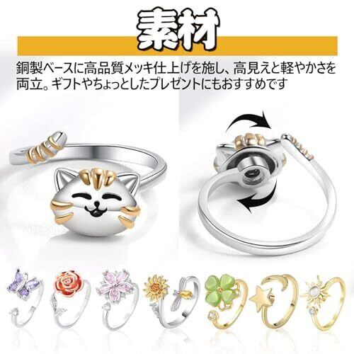 ストレス解消 リング 回転 フィジェットリング 回転 指輪 レディース メンズ サイズ調整可能 スピナーリング ストレス解消 おもちゃ 外出先 職場 教室 長時間フライト向け 集中力 大人用 手遊び かわいい 幸運 グッズ 星 月 花 子猫 アクセサリー (J) [並行輸入品]