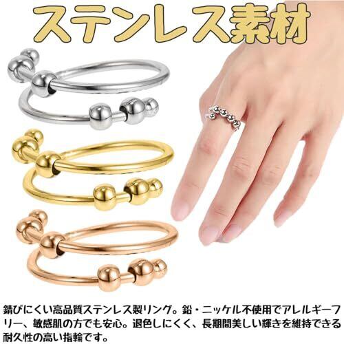 【高品質ステンレス素材】 錆びにくい高品質ステンレス製リング。鉛・ニッケル不使用でアレルギーフリー、敏感肌の方でも安心。退色しにくく、長期間美しい輝きを維持できる耐久性の高い指輪です。 【ストレス軽減&リラックス効果】 回転するビーズを指先で回すことで、ストレス解消・不安緩和・気分転換に最適。日常や仕事中でも気軽に使えるリラックスリング、集中力アップや心を落ち着けたい時に役立ちます。 【サイズ調整可能デザイン】 開口部分を簡単に広げたり縮めたりできるフリーサイズ仕様。指に合わせて調整可能で、男女兼用・ほぼすべての指にフィットします。成長期の子供から大人まで幅広く対応。