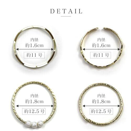 【サイズ】内径約1.6cm~1.8cm (約11号~12.5号) 【素 材】合金 【重さ】約0.2~0.4g 【カラー】ゴールド 【内容量】5個セット 【特 徴】デザイン性があるリングが5個セットになった商品です。重ね付けをしても良し、単品付けをしても良しと、スタイルの幅が広がります。ファッションのワンポイントとしておすすめです。ゴールドの色味は、上品で気品漂う印象をプラスし、シンプルながら力強い存在感を放ちます。