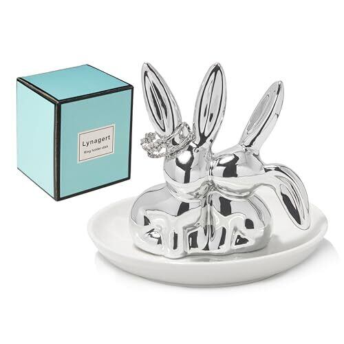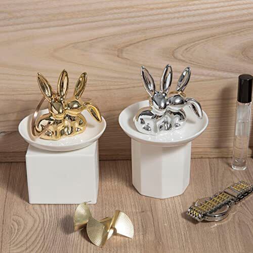 バニーラビットリングディッシュ セラミックジュエリーホルダー ディッシュトリンケットトレイ リングイヤリングネックレスオーガナイザー、ウェディング婚約指輪ホルダー(シルバー)