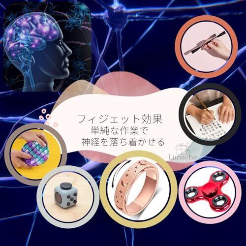 緊張した時や集中を高めるために手を動かすことで、ストレスホルモン(コルチゾール)の分泌を減少させ、リラックス効果が期待できます。また、爪を噛む癖や皮膚をつつく癖を防ぐ助けにもなります。 リング部分がスムーズに回転することで、手の動きに集中させ、不安や心配事を一時的に忘れられる効果があります。イライラ感を和らげ、落ち着きを取り戻すサポートをします。 他のフィジェットツール(スピナーやキューブなど)に比べ、フィジェットリングは非常に静かで、オフィスや教室などの静かな環境でも気兼ねなく使用できます。 単なるストレス解消ツールとしてだけでなく、ジュエリーとしても楽しめるデザイン。男女問わず使えるスタイリッシュなアクセサリーです。 高価なアイテムではなく、手頃な価格でストレス管理や集中力向上といったメリットを得られる点が魅力です。