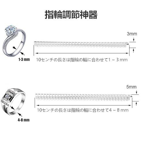【セット内容】:4本の指輪調整用PUスプリングワイヤ,3mm 5mm2つの寸法。 【便利なリングアジャスター】緩くなった指輪を手早く簡単にサイズ調整できる『リングアジャスター』です。スパイラル構造により、指輪に巻き付けるタイプなので、汗や水濡れで外れる心配がありません。※画像の指輪本体は付属しません。 【用途】:指輪に巻きつけるだけで、ゆるい指輪を貴方の指にフィットさせることができます。関節が大きくて指輪が回ってしまう方や、指輪がゆるくなったときに便利です。汗をかく時や手を洗う時にも落ちにくいです。 【注意事項】カットした断面が鋭くなる場合や、衣服に引っかかる場合は、爪ヤスリなどで断面を丸く削ってから装着してください。小さなお子様の手の届かない場所に保管し、誤飲の恐れがあるため、十分に注意して管理してください。直射日光や高温多湿の場所での長時間放置や保管は変形や変色の原因となるため、お止めください。お手持ちの指輪のリング幅によってはサイズが合わない場合もございますので、予めサイズをご確認ください。カットする際は、細心の注意を払って作業を行ってください。 【商品保証について】使用中に問題が発生した際は、お気軽にご連絡ください。24時間以内にご返答いたします。