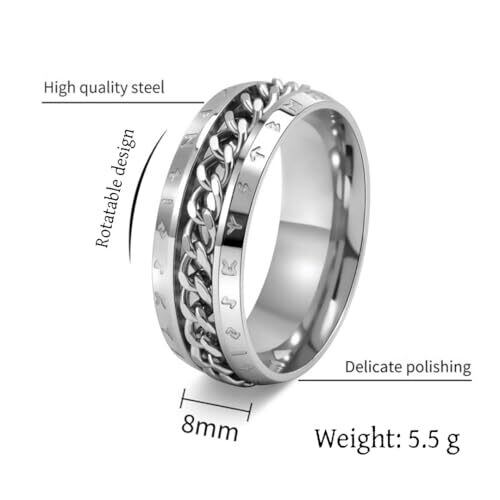 【回転チェーンリング】リング中央に配置されたチェーンが滑らかに回転する構造で 視覚的な動きと立体感を生み 指元に個性と存在感を与えるメンズ指輪です。 【Rockyu 指輪】メンズ向けリングとしてステンレス素材を使用し 表面はなめらかな弧面仕上げです。リング幅は約8mm 重量は約5.5gで シルバー色 ブラック色 ゴールド色の3色を展開しています。 【使用場面】普段使い 通勤 外出 休日のカジュアルスタイル 春夏秋冬 オールシーズン 誕生日 クリスマスなど さまざまなシーンに自然に取り入れられます。