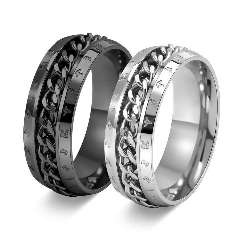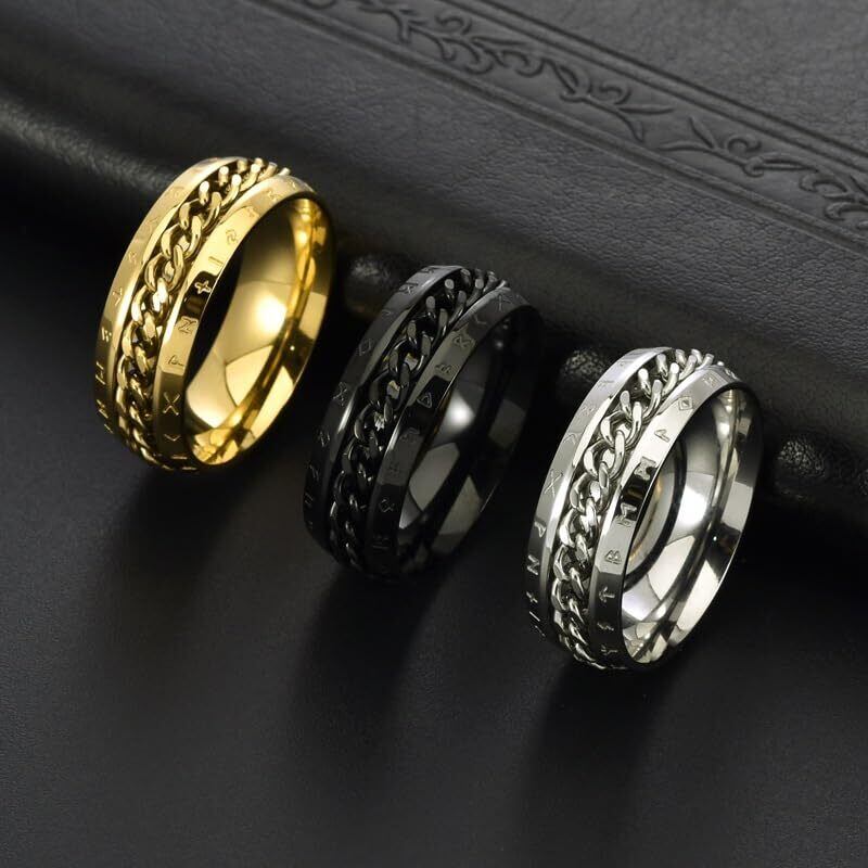 [Rockyu] 指輪 メンズ リング スピナーリング 回転式 チェーン デザイン 北欧風モチーフ シルバー ブラック ゴールド ステンレス 弧面 カジュアル 誕生日 クリスマス ギフト