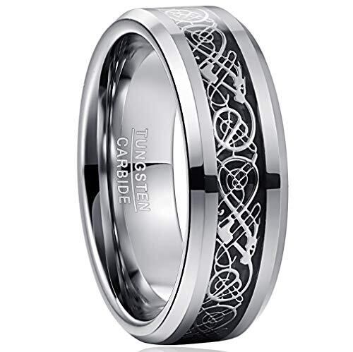 【商品仕様】素材:タングステン(内:炭素繊維);幅:8mm(JPサイズはご案内に参考してください)。 【デザイン】古代ケルト族の描法を用いて描かれたドラゴンのイメージには、魔法をかけったお守りの指輪である。 【タングステン】比重は金とほぼ同じ、硬度はダイヤモンドに匹敵、キズがつきにくくて、錆びないです。金属特有の冷たさは無く、冬の季節の使用は良いです。 【多用途のリング】カジュアルからフォーマルまで幅広く活躍して、スーパーの人気なリングです。大切な人へ誕生日、婚約式、結婚式、お祝い、記念日、クリスマス、バレンタインデーなどのお贈り物やプレゼント、ご褒美としてもピッタリです。