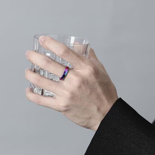 ① 人気シリーズのカラーバリエーション 多くのお客様にご好評いただいているシリーズに、レインボーカラータイプを追加しました。 ② ファセットカットデザイン 表面に多面カットを施し、光の当たり方によって表情が変わるデザインに仕上げています。 ③ レインボーカラーコーティング仕上げ 表面にはPVD加工を施しており、日常使いを想定した仕上げとなっています。 ※使用状況により、色味の変化が生じる場合があります。 ④ 4mm・6mmの2サイズ展開 細身から程よい存在感のある幅まで、お好みに合わせてお選びいただけます。
