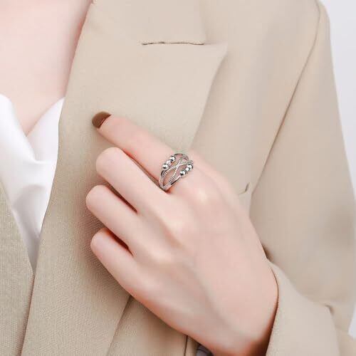 [Rockyu] リング レディース 多層クロスデザイン 開口式 シルバー調 可動ビーズ付き ミニマル おしゃれ 指輪 幾何学風 フリーサイズ アクセサリー 誕生日 バレンタインデー クリスマス ギフトに最適