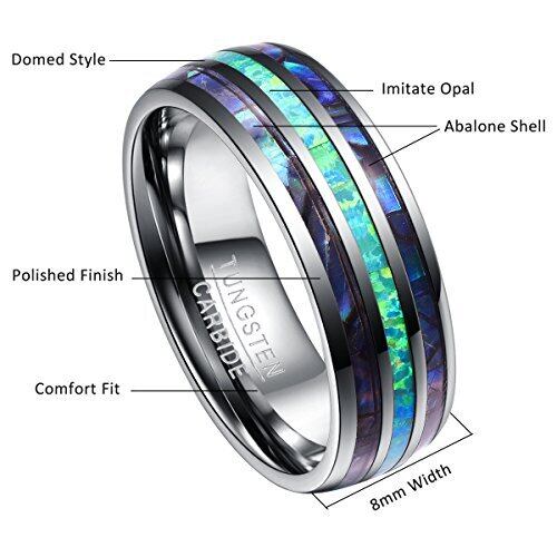 【商品仕様】素材:タングステン、オパール、アワビシェル。サイズ:幅8mm(サイズはご案内図に参考してください)。箱入りと袋入りの2種類の包装がランダムに出荷されます。 【タングステン】金とほぼ同じ比重で、ダイヤモンドにも匹敵する硬さ、変形に強い、傷に強い、錆にくい、輝き長持ちなどの特性、金属アレルギーも対応し、レアメタルです。 【アバロンシェル&オパール】アバロンシェルはアワビの殻です。「孔雀貝」、「パウア貝」とも呼ばれ。アバロンシェルとオパールはその虹色に輝く美しさから昔から世界中でお守りや魔除け、また工芸品として大事にされてきた。アクセサリーとして身に着けるとどこかミステリアスな印象をプラスします。
