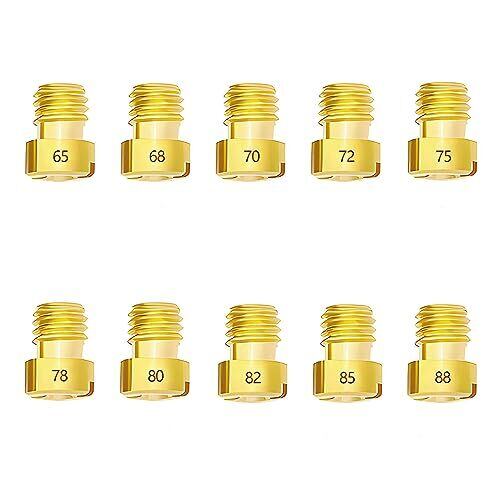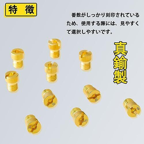 【10個1セットで】バイク用メインジェット[6×8]10個10サイズを含みます。仕様:#65、#68、#70、#72、#75、#78、#80、#82、#85、#88(各1pcs)。【注意事項】ご購入頂く前に、ご自分のキャブレターのサイズを確認してご購入ください。 【お勧めポイント】本商品は真鍮製で、折れや変形がなく、耐摩耗性、高温耐性、耐老化性にも優れます。番数がしっかり刻印されているため、使用する際には、見やすくて選択しやすいです。合計10個セットでご用意しておりますので、惜しみなく愛車のメンテナンスにご活用下さいませ。 【使用注意ポイント】 本製品は小さいパーツなので、小さなお子様には近づけないでください。作業などを行う際は、必ずエンジン及びマフラーガ冷えている時に行ってください。走行前は、必ず各部を点検し、ネジ部などの緩みがないことをご確認ください。取り付けについては、ご自身での取り付けが不安な方は、専門の方に相談することをおすすめします。 【Pronese製の様々なバイクパーツ】弊社はいろいろな仕様のメインジェット(セット販売)、パイロットジェット(セット販売)、燃料ホース、燃料フィルター、ホースクランプ等のバイク用・車用の製品を販売しております。製品についてご不明な点がございましたら、ご遠慮なくお問い合わせください。間違って購入しないよう、十分に注意してご購入するようお願いいたします。 【 メーカー保証付き!】 本製品には、輸送中にパケージの破損や初期不良や悪質な商品が出る場合がございましたら、お早めにご連絡ください。その場合には、こちらが責任を持って、迅速に交換・返品・返金処理をいたしますため、ご安心購入ください。
