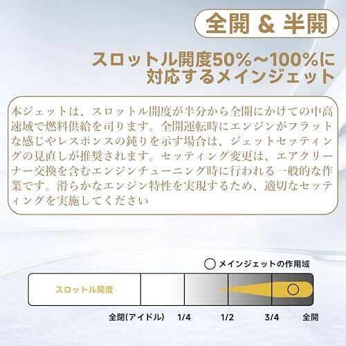 【6種サイズセット】 メインジェットを#125、#130、#135、#140、#145、#150まで6種類(各1個)セットにしてお届け。番数が大きいほど穴径が大きく燃料供給量が増え、小さいほど減少するため、エンジンチューニングに柔軟に対応可能。 【高精度仕様】 直径6mm×高さ8mmの標準規格。各車種の専用設定で使用頻度の高いサイズを選定し、汎用性と互換性を両立。 【幅広い適合車種】 FTR223(-2009)/FTR250 / 250TR / エストレヤ / W650(要2セット)/ SB250 / KLX250 / XR230/M(-2009)/ XR400(2005) / SL230 / XLR250R/BAJA / XL-DEGREE / 250SB(2003-2004)/ CB223/250(-2009) / W650 ※(2sets are Required) / 250TR(2002-2006) / KLX250(1998-2007) /ESTRELLA(-2006) / Dトラッカー(-2007) BROS400('88~'89) / NSR250R('88) / GB250(シングルキャブ) / XR250/BAJA('01~'04)C / ZZR1200(マレーシア仕様) / GPZ900R A3アメリカ仕様 KR-1 / MBX50など多数の車種に対応。 【エンジン性能向上に不可欠】 キャブレターの中速域~高速域(スロットル半開~全開)で燃料流量を制御。全開時に加速不良やエンストが発生する場合、適切なサイズに交換することで最適な空燃比を実現。 【チューニング作業に最適】 エアクリーナー交換、排気管アップグレード、エンジン改造などのチューニング時に必要な部品。6種類のサイズから最適なものを選択し、エンジンのポテンシャルを最大限に引き出せる。