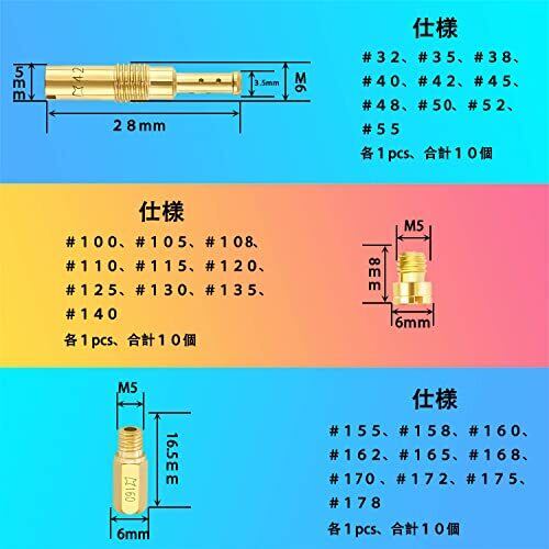 【30個1セットで】3種類で、20個のメインジェットと10個のパイロットジェット、合計30個を含みます;メインジェット(Aタイプ):#100#105#108#110#115#120#125#130#135#140(各1pcs);メインジェット(Bタイプ):#155#158#160#162#165#168#170 #172#175#178(各1pcs);パイロットジェット:#32#35#38#40#42#45#48#50#52#55(各1pcs) 【お勧めポイント】本商品は真鍮製で、折れや変形がなく、耐摩耗性、高温耐性、耐老化性にも優れます。番数がしっかり刻印されているため、使用する際には、見やすくて選択しやすいです。合計30個セットでご用意しておりますので、惜しみなく愛車のメンテナンスにご活用下さいませ。30個別々30サイズのメインジェットが含まれるため、自由に選択できて適合車種が多いです。 【使用注意ポイント】 ご購入頂く前に、ご自分のキャブレターの適合サイズを確認してご購入ください。本製品は小さいパーツなので、小さなお子様には近づけないでください。作業などを行う際は、必ずエンジン及びマフラーガ冷えている時に行ってください。走行前は、必ず各部を点検し、ネジ部などの緩みがないことをご確認ください。取り付けについては、ご自身での取り付けが不安な方は、専門の方に相談することをおすすめします。 【Pronese製の様々なバイクパーツ】弊社はいろいろな仕様のメインジェット(セット販売)、パイロットジェット(セット販売)、燃料ホース、燃料フィルター、ホースクランプ等のバイク用・車用の製品を販売しております。製品についてご不明な点がございましたら、ご遠慮なくお問い合わせください。 【メーカー保証付き!】 本製品には、輸送中にパケージの破損や初期不良や悪質な商品が出る場合がございましたら、お早めにご連絡ください。