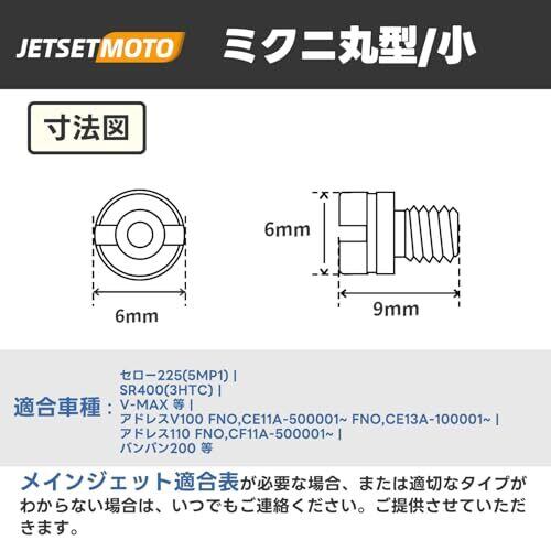 【メインジェット詳細】ミクニ 丸/小 [6×9] #60 #62 #65 #68 #70 #72 (各1個)6サイズ。ご購入頂く前に、ご自分のキャブレターの適合サイズを確認してご購入ください。 【適合車種 】セロー225(5MP1) | SR400(3HTC) | V-MAX 等 | アドレスV100 FNO,CE11A-500001~ FNO,CE13A-100001~ | アドレス110 FNO,CF11A-500001~ | バンバン200 等 【サイズ】ミクニ製丸型・小サイズ(直径6mm×高さ9mm)のメインジェットを、各車種専用設定に合わせて常用されるジェット類をセットにし、より手軽にお求めいただけるようにしました。 【メインジェット 用途】高品質な製品でより安全で豊かなモーターサイクルライフを実現するために開発され、各種スクーターの純正キャブレターに対応するメインジェットです。エアフィルター交換時には、適切な燃料調整を行うことでエンジンの性能を最大限に引き出すことができます。 【おすすめポイント】本品は高品質の真鍮を採用しており、折れや変形に強く、耐摩耗性・耐熱性・耐久性に優れています。また、番号は高精度で刻印されているため、鮮明で、視認性と操作性に便利です。