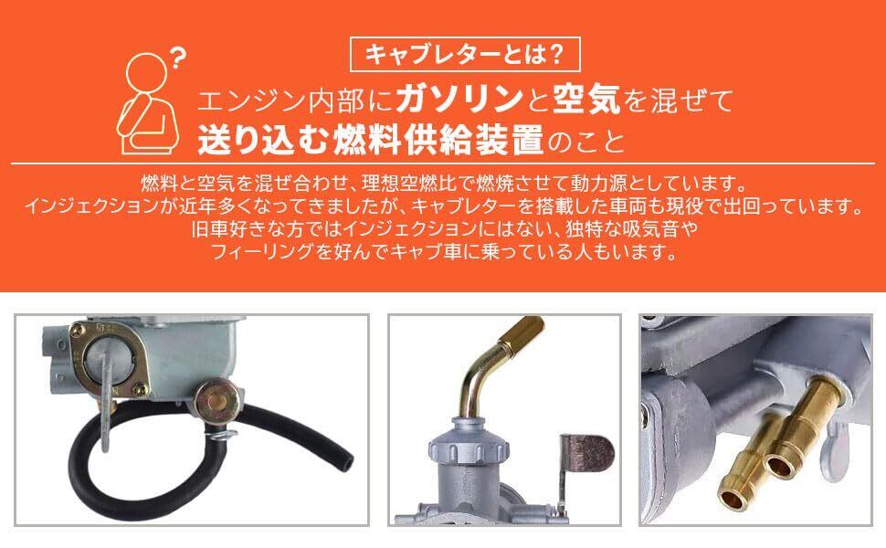ホンダ 旧 ダックス ST50 ST70 CT70 6V キャブレターの社外品です。 適合車種:ホンダ 旧 ダックス ST70 CT70 ST50 K1 K2 K3 K4 72cc 6V 等 キャブレターとはエンジン内部にガソリンと空気を混ぜて送り込む燃料供給装置の事を言います。燃料と空気を混ぜ合わせ、理想空燃比で燃焼させて動力源としています。インジェクションが近年多くなってきましたが、キャブレターを搭載した車両も現役で出回っています。旧車好きな方ではインジェクションにはない、独特な吸気音やフィーリングを好んでキャブ車に乗っている人もいます。 バイク好きな方はDIYで整備したり、季節ごとに調整する事を楽しむ事もありインジェクションよりもキャブレターを好まれる方も多いです。長期間不動車として放置されたり、走行距離が伸びていたりするとガソリンの不純物(ゴミ、埃、錆び等)が付着してジェットが詰まって理想空燃比が保てずエンジン不調を起こす場合があります。 セッティングしても調子が悪い、加速がスムーズでなくもたつきがあるという現象はキャブの不調が考えられます。オーバーホールでは時間と労力がかかりますので、純正互換品のリーズナブルな社外品に丸ごとアッセンブリー交換してしまったほうが結果的に安く済む場合があります。 愛車を新車時の滑らかなフィーリングで乗りたい方、動かなくなった愛車を再び蘇らせたい方の整備にお役立て下さい。パーツが手に入る内にガレージにストックしておけば、いざという時整備することができますので安心です。※取り付けの際、加工が必要となる場合があります。