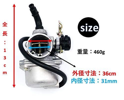 ✅ 品質に優れた 社外品 PZ19 ハンドチョークキャブレター 汎用品 交換用 です。チョークはワイヤーで操作されます。 ✅適合車種:50cc 70cc 90cc 110cc 125cc クラスのバギーゴーカートダートやチャイナ ATV オートバイ クワッド モンキーバイク 等に適合 ✅ 仕様【 口径サイズ 】 ✅ ボルト穴間隔:47mm ✅ 吸気口径:19mm/ エアフィルターマウント側 (外径) 36mm (内径) 31mm 【 重量 】 460g ✅【 全体size 】縦: 約13cm 【 ホース長さ 】✅ドレンホース 約 26cm ✅経年の劣化による錆や腐食は目に直接見えないためかなり進行しています。 それによりトルクの減少・アイドリングの不安定・燃費の悪さの原因かもしれません。 ✅既存のキャブと交換することでトルク、パワーがUPします。キャブレターを定期的に交換することでエンジン性能を維持することができます。 ✅経年のサビや腐食は故障の原因になります。 始動不良、パワー不足を感じた時の交換用にご使用いただけます。キャブレター内部を清掃してご使用ください。 ■必要なパーツはいずれ生産が中止され入手困難になりますので、入手できるうちにストックしておくことをお勧めします。 ■交換用としてストック/保管しておくことをお勧めします。