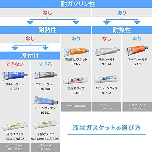 【用途】耐ガソリン、耐オイル、耐クーラント性に優れた溶剤ベースのゴム系液状ガスケット。ガソリンコック、キャブレター、シリンダーヘッドカバー等にご利用いただけます。 【仕様1】完全硬化24時間 【仕様2】適用温度:−54から204度 【仕様3】容量:8g 【その他】ゴムを侵す特性があるため、薄いOリングがある接合面には適しません