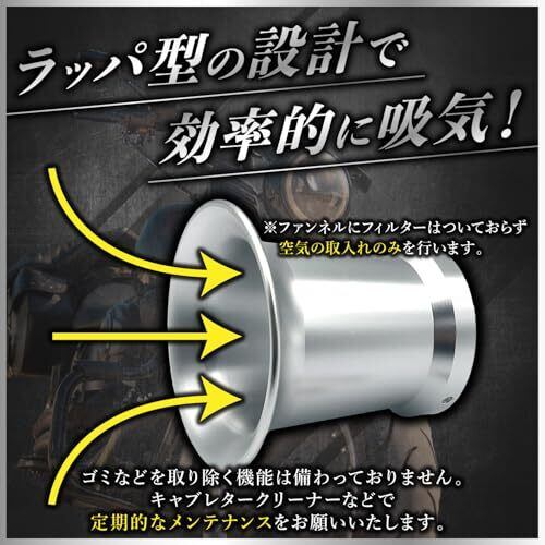 バイクの吸気効率の向上に一役買うエアファンネル! バイクキャブレターのメンテナンス、カスタムパーツとしていかがでしょうか。 当エアファンネルは、高さ75mmとなります。お手持ちのバイクエンジンの回転数に応じてお選びください。 また、取り付けネジは簡易取り付けネジになります。 エアファンネルの本格取り付けやドレスアップ目的の方は、別途イモネジをお買い求めください。 このエアファンネルに交換、取り付けを行うことでキャブレターのパワーや吸気効率、バイクの燃費の向上につながります。 また、バイクのドレスアップにもおすすめです。 キャブレター式のバイクにお使いいただけるアルミ製のエアファンネルです。 ファンネルにフィルターはついておらずあくまで空気の取り入れのみを行います。ゴミなどを取り除く機能は備わっておりません。 キャブレタークリーナーなどで定期的なメンテナンスをお願いいたします。 サイズ:φ50(直径)×高さ75mm バリエーション:シルバーとブラックの2カラー 各カラーともに、1個と2個セット揃えております。 材質:アルミ製 当商品汎用品です。キャブレターへの取り付けサポートは行っておりません。説明書の付属もございませんので、取り付けは業者などにご依頼くださいませ。担当スタッフによる検品と気泡緩衝材による徹底梱包をおこなっております。