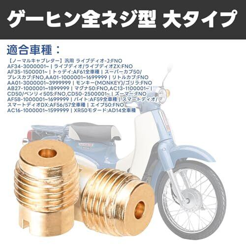 【メインジェット 全ネジ型/大 詳細】キャブレターメインジェット#70、#72、#75、#78、#80、#82、#85、#88、#90、#100。合計10個セットです。 【メインジェットのサイズ】メインジェット 全ネジ型/大 直径7mm×高さ8.5mm、M7×P0.75 。各車種専用設定で使用頻度の高いジェット類をSETにしてお求めやすくなりました。 適合車種 【ノーマルキャブレター】ライブディオ-J:FNO,AF34-3000001~ | ライブディオ/ライブディオZX:FNO,AF35-1500001~ | トゥデイ:AF61全車種 | スーパーカブ50/プレスカブ:FNO,AA01-1000001~1699999 | リトルカブ:FNO,AA01-3000001~3999999 | モンキー(MONKEY)/ゴリラ:FNO,AB27-1000001~1899999 | マグナ50:FNO,AC13-1100001~ | CD50/ベンリィ50S:FNO,CD50-2500001~ | ズーマー:FNO,AF58-1000001~1699999 | バイト:AF59全車種 | スマートディオ/スマートディオDX:AF56/57全車種 | エイプ50:FNO,AC16-1000001~1599999 | XR50モタード:AD14全車種 【メインジェット 用途】高品質な製品がより安全で豊かに広がるモーターサイクルワールドをクリエイト。各種スクーターのノーマルキャブレターに適合するジェットSET、メインジェットです。エアフィルーターの交換時はセッティングを施して下さい。 購入前に、製品がご自身の必要なものかどうか、形状やサイズが愛車に合っているかをご確認ください。