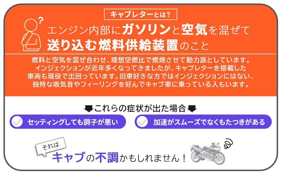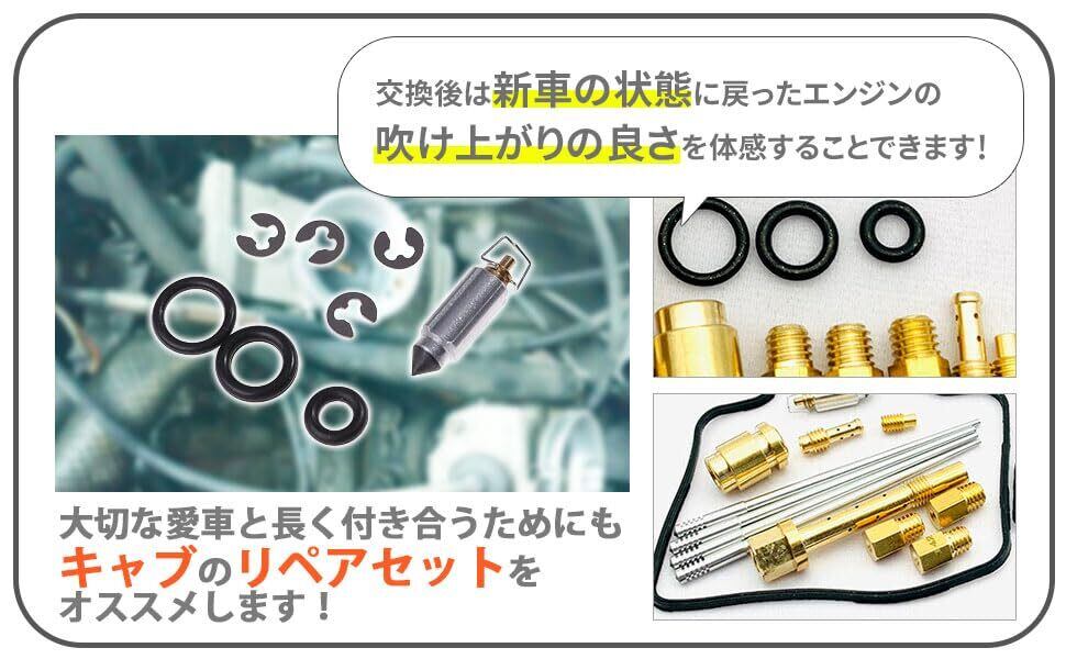 適合車種:スズキ RGV250 ウルフ250 VJ21A VJ22A メインジェット:#250、#260 スロージェット:#20短、#27.5長 RGV250 FNO:VJ21A-100001 ~ 117638 #200 / RGV250 FNO:VJ21A-117639 ~ #260 / RGV250 FNO:VJ22A-100056 ~ 108073 #250+#260 / RGV250 FNO:VJ22A-108074 ~ 120212 #260+#260 / RGV250 FNO:VJ22A-120213 ~ #250+#260 / RGV250-SP FNO:VJ22A-100066 ~ 120222 #270+#280 / RGV250-SP FNO:VJ22A-120223 ~ #240+#250 / ウルフ 250 FNO:VJ21A-100001 ~ 118698 #190+#240 / ウルフ 250 FNO:VJ21A-118699 ~ 128333 #240 / ウルフ 250 FNO:VJ21A-128334 ~ #210+#220 等 SUZUKI 用 RGV250 ウルフ250 VJ21A VJ22A キャブレターリペアキット オーバーホールキット 1台分 2個セット 社外品になります。キャブレターとはエンジン内部にガソリンと空気を混ぜて送り込む燃料供給装置の事を言います。燃料と空気を混ぜ合わせ、理想空燃比で燃焼させて動力源としています。インジェクションが近年多くなってきましたが、キャブレターを搭載した車両も現役で出回っています。 旧車好きな方ではインジェクションにはない、独特な吸気音やフィーリングを好んでキャブ車に乗っている人もいます。バイク好きな方はDIYで整備したり、季節ごとに調整する事を楽しむ事もありインジェクションよりもキャブレターを好まれる方も多いです。長期間不動車として放置されたり、走行距離が伸びていたりするとガソリンの不純物(ゴミ、埃、錆び等)が付着してジェットが詰まって理想空燃比が保てずエンジン不調を起こす場合があります。セッティングしても調子が悪い、加速がスムーズでなくもたつきがあるという現象はキャブの不調が考えられます。 キャブレターも長期間使用していると、不具合の発生や劣化してしまいます。キャブ洗浄で汚れを落としても調子が悪い場合、オーバーホールが必要になります。キャブのリペアキットは劣化した部品の交換で新車時の性能を取り戻すためのオーバーホールをするための商品です。交換後は新車の状態に戻ったエンジンの吹け上がりの良さを体感できます。大切な愛車と長く付き合うためにも、キャブのリペアキットをお勧めします。必要な部品を揃えてありますので、このままオーバーホールにご使用頂けます。