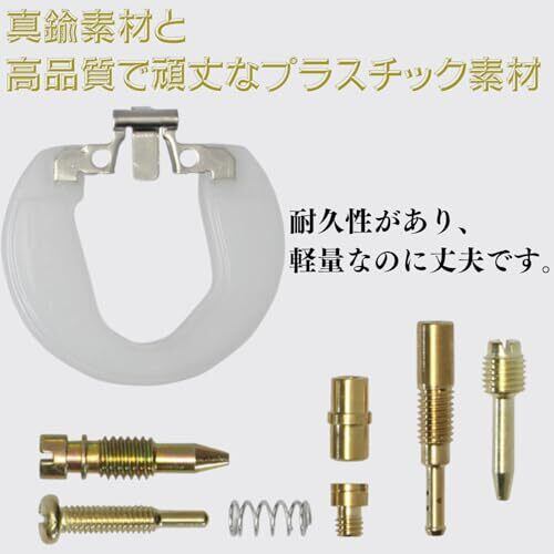 スーパーカブや50cc 70cc 110ccのオートバイ等、PB16 PZ19 に対応のリペアキット キャブレター オーバーホールキット パーツのセットになっています。 ガソリン漏れ、オーバーフローや調子が悪い場合の修理、補修に役立つキットになっています。 キャブレターの交換、固定にもご使用いただけます。 【適合車種】PB16 PZ19。ジェットニードル、メインジェット、ボルト、スプリング等必要な部品、パーツのセットになっています。 真鍮素材と高品質で頑丈なプラスチック素材で作られており、耐久性があり、軽量なのに丈夫です。 さまざまなバイク、オートバイと互換性があり、汎用性も抜群です。 分かりやすい設計で、取り付けも簡単。