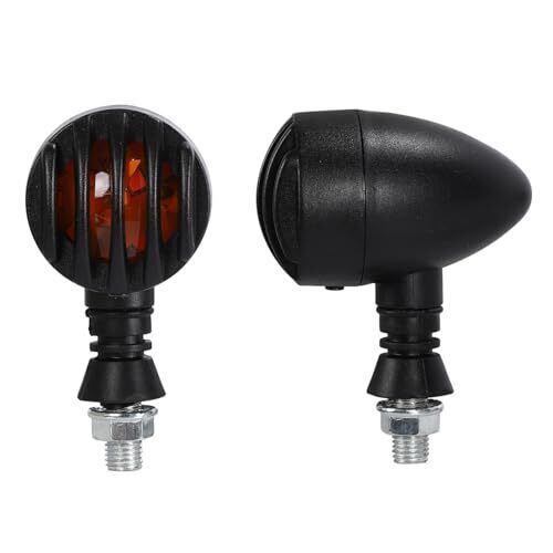 クラシックスタイルにマッチするウインカーです。 マットブラックで渋い風合いです。 レンズ前にはメタルガードあり。ハイフラ(ウインカー点滅が早くなる)になる場合、ウインカーリレーの用意が必要な場合があります。 ポジションとウインカーの明るさは同じで 配線は黒がアース(マイナス)、赤をプラスの配線に繋いでご利用ください。 12V仕様 サイズ 本体:直径 約40mm × 奥行 約70mm 取付ボルト:M10(10mm) 配線長 約400mm取付ボルト:M10(10mm) ・オリジナルパッケージ商品です。