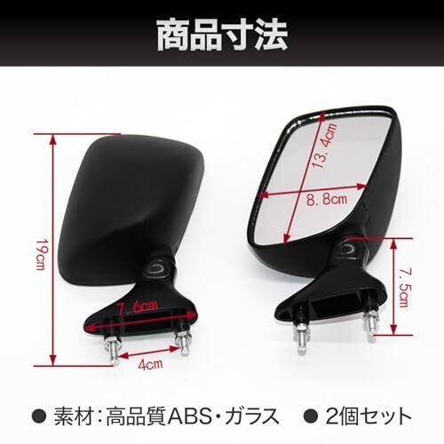 ✅【バイクカスタムの必需品】汎用タイプで様々なバイクやオートバイに取り付けることができるカウルミラー(バイクミラー)左右セットになります。フロントカウルはもちろん、ロケットカウル、ハーフカウル、レーシングカウルなどにもオススメです。カスタムやドレスアップのアイテムとしても是非! ✅【360度回転!自由自在に調整可能】高品質なABSプラスチックで作られていて耐久性があり、ミラーは上下や前後に360度回転するので、お好きな角度に自由に調整することができます。さらに、角型の平面レンズで広い視野を確保できるので、安全運転ができるなど、機能面にも拘っています。 ✅【適合車種一例】CBX400F/550F、CBR400F、CB400SF、CB250T、CB250N、CB400/T/N、ホーク、VF400F、VT250、VTZ250、XJR400/R、4HM、RH02J、GX250、RD/250/400、XJ400/D/E、XJ750/E、RZ250、4L3、RZ350、4UO、FZR250R、1990、1993-1994/FZR400、FZR400R、FZR400RR、1990/FZR400RR、SP 1992 1994/FZR600RR、1989、1990、1992/TZR250、3XV、V2 1990-1995、GS400、GT380、GT250、GSX250E/400E、GSX400FS、GSX400、インパルス、バンディット/250/400 ※その他、サイズが合えば他の車種にも取り付け可能ですが、加工が必要になる車種もあるのでサイズなどご確認ください。 ✅【取り付け方法/保証について】取付位置に約11mmの穴を2か所空けて本体を取り付け、取付け時は必要に応じて市販のM6ワッシャーを付けて付属のナットで締め付けて下さい。保証は30日なので万一不良など、商品に問題がありましたら返金します。また、製品の性質上、小傷などある場合がありますので予めご了承ください。 ✅【仕様/サイズ/付属品】横幅:約13.4cm 、ステー、ボルト込みの横幅:約19cm、高さ:約8.8cm、厚み:約5.9cm、ネジのサイズはM6(6mm)、取付ナット付き、取り付けネジ間:約4cm(ネジの内側)※ネジの中心からなら約4.5cmになります。
