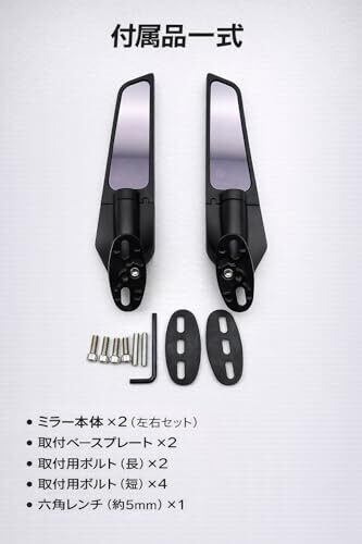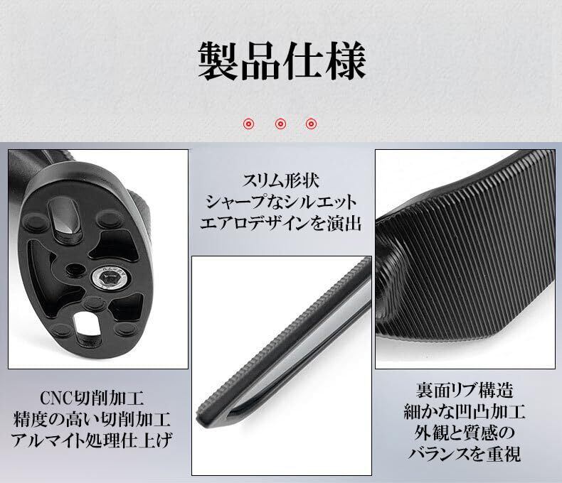 ミラー形状:平面 構造:回転可動式 本体材質:アルミ合金 / ABS ミラー材質:合金 セット内容:左右2本 カラー:ブラック