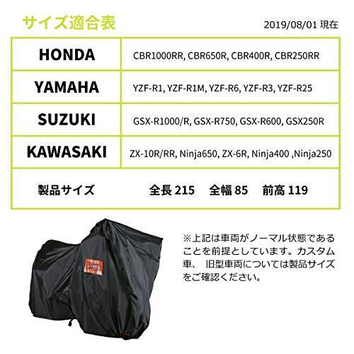 サイズ: W215 ×L(D)85× H119cm、収納サイズ:W20 ×L(D)35× H12cm 重量:1kg、材質:ポリエステル 製品特徴:スポーツ乗りのためのSS専用バイクカバー。サイズが合っていないがゆえに発生するカバーのバタつきや泥ぼこりの付着、スリ傷、ひっかけ傷を防止。 スポーツバイク専用設計で排気量に関係なく適合するフィット感を追求。カウルミラー専用のカバー形状、アップマフラーもカバーする難燃生地エリアの広さ。 着脱時間を大幅に短縮するメインファスナー。 適合車種:HONDA / CBR1000RR、CBR650R、CBR400R、CBR250RR、YAMAHA / YZF-R1、 YZF-R1M、 YZF-R6、 YZF-R3、 YZF-R25、SUZUKI / GSX-R1000、GSX-R750、GSX-R600、GSX250R、KAWASAKI / ZX10R/RR、Ninja650、ZX-6R、Ninja400、Ninja250 製品の詳細や最新情報はメーカーホームページをご確認下さい。