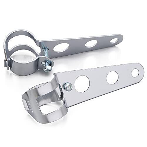 【用途】バイク用 フロントフォーククランプ ヘッドライトステー 【仕様1】フロントフォーク対応直径:Φ30-39mm、ヘッドライト取付穴径:Φ10.5mm 、フォーク中心部からヘッドライト取付穴中心部:117mm 【仕様2】左右セット 【仕様3】スチール製クロームメッキ仕上げ
