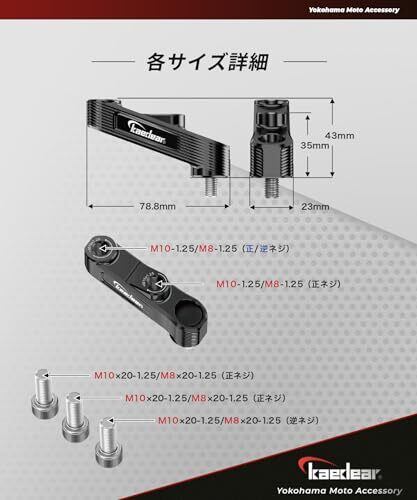 Kaedear(カエディア) バイク ミラーアダプター オフセット ミラーライザー アルミニウム合金 M8×1.25 正ネジ 2個入り ボルトM8×20×1.25正ネジ×2本/逆ネジ×1本 オフセットアダプター KDR-UHR1-408R (ブラック, M8正)
