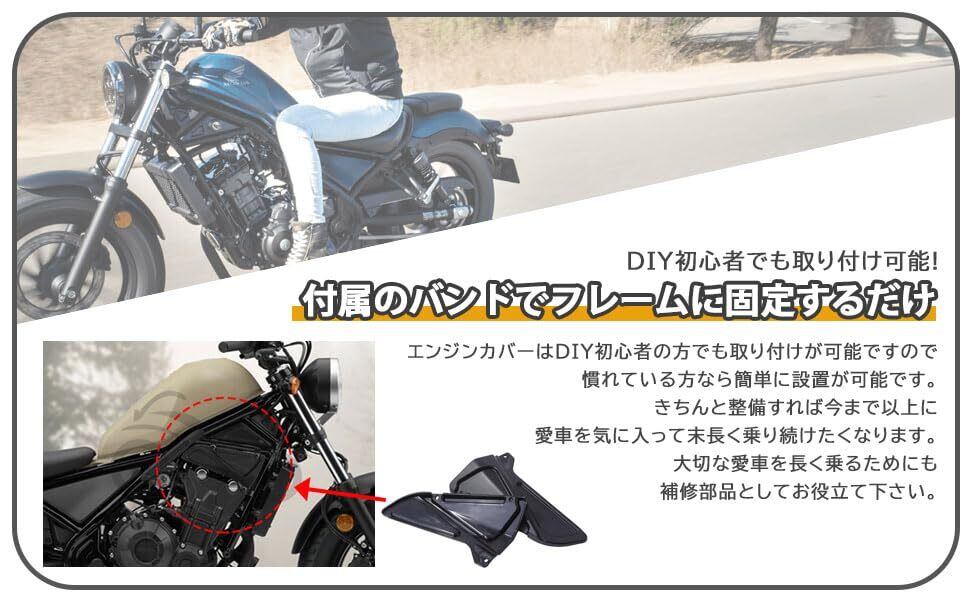 HONDA レブル250 500用 エンジンカバー サイドカバー ブラック 社外品になります。適合車種:ホンダ レブル250 500 等 材質:ABS樹脂 カラー:マットブラック 2輪車ですので気を付けていても立ちゴケや転倒で、エンジンカバーに傷が付いたり、割れてしまったりします。修理するにしても手間や時間がかかります。もし割れてしまった場合には新品に交換するほうをオススメします。交換するにしても高価な純正部品を使うのではなく、純正部品同等のリーズナブルな社外品を使用することによってコストを抑えることができます。 車種専用設計ですので、純正部品のように違和感無く車体に取り付けることが可能です。経年劣化で洗車しても汚れや傷でキレイにならなくなってしまったり、変色や割れ、カケ等が感じられたら新品に交換してリフレッシュするのもお勧めです。 エンジンカバーはDIY初心者の方でも取り付けが可能ですので、慣れている方なら簡単に設置が可能です。取付け方法は付属のバンドでフレームに固定するだけです。きちんと整備すれば今まで以上に愛車を気に入って、末長く乗り続けたくなります。 大切な愛車を長く乗るためにも補修部品としてお役立て下さい。劣化したパーツを交換する事により愛着が湧きライディングがより楽しめるようになりますので、是非修理、補修で交換されることをお勧めします。パーツが手に入る内にガレージにストックしておけばいざという時安心です。