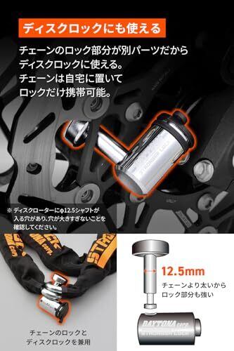 カギ1本で2つのロックを管理。2.0mのチェーンロック+U字ロック 42mm幅のφ12mm極太チェーンで盗難抑止 熱処理されたスチール合金製により、ノコギリやカッター、ハンマーでの破損を防止 ディスクロックとしても使えるコンパクトロック ピッキングに強いディスクシリンダーキーを採用