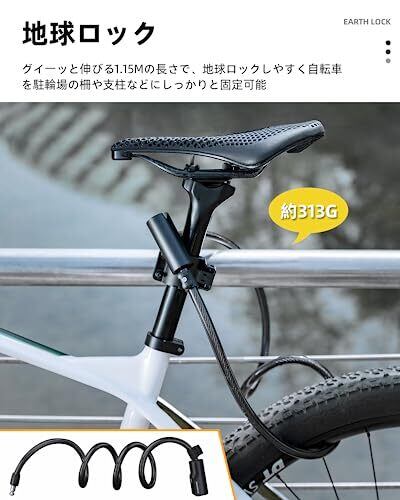 【頑丈・防犯性が抜群】防錆加工された頑丈な7本のワイヤー×7束合わせて49本のワイヤーで構成された自転車鍵は切断されにくく高い防犯性を持っています。横断面直径約13mm、安心安全のタイプです。ロックのヘッド部分はABS素材で作られており、変形しにくくて耐衝撃性と耐久性も優れています。また、シリンダー部分も亜鉛合金製の破壊されにくいタフな仕上がりで、錆びにくく防犯性も向上します。コピーが困難でピッキングされにくい、特殊なウェーブ形状の鍵2本付きで、防犯性がよくロックの暗証番号を忘れて開錠できない場合も避けられます。 【地球ロック・PVCカバー】グイーッと伸びる115cmの長さで、地球ロックしやすく自転車を駐輪場の柵や支柱などにしっかりと固定可能で、自転車複数台の同時ロックも可能になります!ケーブルの表面はしっかりとしたPVC素材で覆われており、手触りがよく、防水防錆でご愛車の車体も傷つけにくいです。 【操作簡単】カチッとはめるだけの楽々設計を採用しており、ロックの施錠/開錠に手間取らず簡単に操作できます。鍵穴にはダストカバー付きで、スライドして開閉可能で水、塵や砂などからの詰まりやサビの予防になって長く持ちできます。 【携帯便利】シートポストへの固定が可能な専用マウントが付属して、自転車の乗車の際には、ワイヤーロックをシートポストに取り付けて、空いたスペースが有効活用可能で、走行中の邪魔にならなくて楽になります。(対応シートポストの直径:約28〜39mm) 【商品仕様・大適用】伸びた長さ:約1.15m 太さ:約13mm 重量:約313g 付属品:専用マウント*1 ガスケット*2 鍵*2 この自転車ワイヤーロックはロードバイク、MTB、クロスバイク、ママチャリ、折りたたみ自転車などの各種自転車だけでなく、バイク、キックボード、ベビーカー、スーツケース、ドアなどにもお使い頂けます。