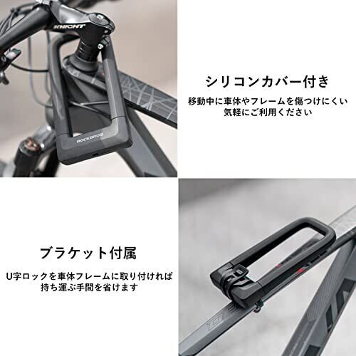 【極太U字ロック】ROCKBROSのU字ロックは、直径約14mmの高強度合金鋼と亜鉛合金シリンダーを採用。高い硬度と耐切断性で、防犯性を高めます。高強度な駐輪場ポールなどに車体をしっかり固定し、盗難防止に貢献します。 【ワイヤー付き】適用範囲を広くなるの為、ケーブルと組み合わせて使うことがより安心です。ワイヤーは軽くて強いスチールコードを編み込んだダブルケーブルで作られているので、切断しにくい。U字ロックと併用して、より便利です。 【シリコンカバー付き】大事な自転車やバイクを守る、表面には触り心地がいいシリコンカバーを採用、ロックに仕上げました。移動中に車体やフレームを傷つけにくい、気軽にご利用ください。付属のブラケットでU字ロックを自転車に固定し、車体フレームに取り付ければ持ち運ぶ手間を省けます。 【鍵式ロック】簡単施錠で使いやすさを追求、施錠/開錠に手間取らずです。鍵2本付き。鍵の紛失の心配はありません。鍵穴の防塵カバーが付きているので、ホコリや水等から鍵穴を守ります。錆などを防止して、使用寿命が延長できます。 【安心の品質保証】大切な自転車の盗難防止に!重量は約805g、サイズは写真で参考ください。自転車だけでなく、オートバイ、電動自動車、原付、スクーター、ドアなどに適用するU字ロックです。自転車鍵に関して不満のところがあれば、遠慮せず連絡をお願いいたします。