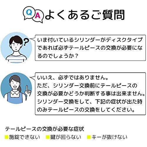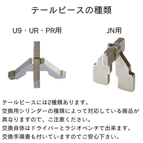 MIWA ( 美和ロック )のLIX・LSPのディスクシリンダーからU9・UR・PRシリンダーに交換する際に必要なパーツです。 テールピースの交換は必ず必要というわけではありません。シリンダー交換後に鍵が抜けない、回らないといった症状が出た時のみテールピース交換を行ってください。 交換はドライバーとラジオペンチで簡単にできます。また交換手順が書かれた説明書も付属しておりますので、ご安心ください。
