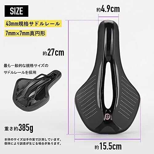 【人間工学に基づき設計】痛みや負担の軽減を考えたスポーツタイプサドルです。横幅を広くとったワイド設計、骨盤や臀部の負担になりにくくロングライダーにおすすめ。ウェーブ形状で座り姿勢の多いロングライドでも着座位置が安定しやすくフォームが乱れにくいです。 【地面からの衝撃を吸収】幅広でラウンド形状な座面で、安定して長く座れる柔らかい低反発タイプのサドルです。自転車サドルは固すぎず、柔らかすぎないクッション性のしっかりした高密度海綿クッション素材をインナーに採用します。身体の重量や衝撃を和らげてお尻の痛みを軽減してくれます。 【通気性の穴空きのデザイン】サドル座面の真ん中に穴が空いている、中空デザインです。サドルに触れる面積を少なくし、通気性があります。穴空きと溝により、尿道部への圧迫を軽減。ライド後の痺れや痛みを緩和する効果がありますよ。 【おしゃれ&撥水性】座面はマットな見た目のPU素材に、光沢のあるデザインプリントを施しています。快適、耐久、滑り止め、磨耗性も強い、PU素材は撥水性に優れ、もし濡れたときは乾いた布で拭くだけで簡単お手入れ。シンプルながらも目を惹き印象的なデザインです。 【適用車種】サドルレール規格:43mm、サドルレール径:7mm×7mm。ロングライドを楽しみたいチャリダーさんに/一定の速度で走りたい方に/女性ライダーさんにも/上体を起こし比較的ゆっくり走るライダーさんに/マウンテンバイク/ロードバイク/クロスバイク/スノーバイク/電動自転車/折り畳み自転車/ママチャリ/スポーツタイプのミニベロに
