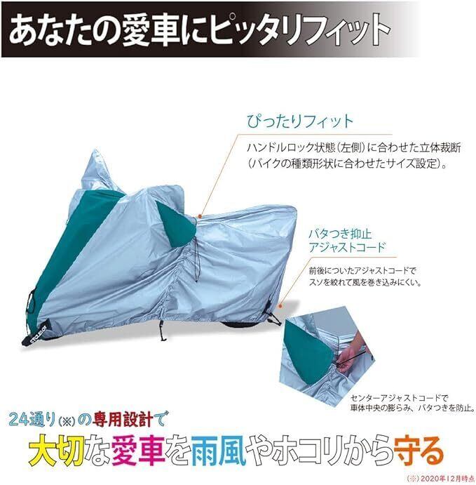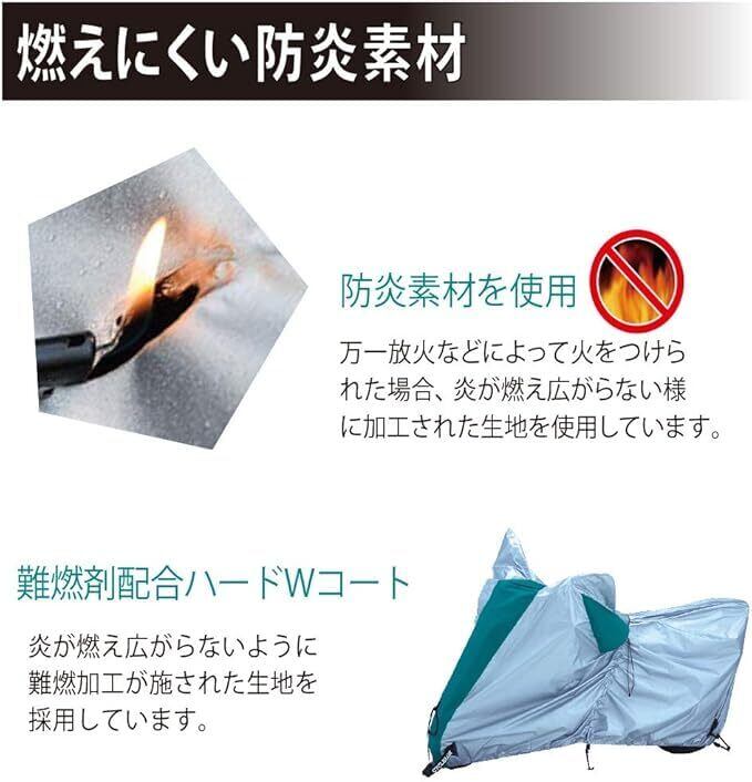 快適エアベンチレーション付き。防炎素材を使用したバイクカバー。 両サイドに立体大型ベンチレーションを設け、カバー内の湿気を効果的に逃がします。 万一放火などによって火をつけられた場合、炎が燃え広がらないように加工された防炎素材を使用しています。 16色の切返しデザインにより、装着時に前後の位置が一目でわかる。アジャストコードで前後どちらからでも簡単にしっかり絞ることができます。 アジャストコードで前後どちらからでも簡単にしっかり絞ることができます。