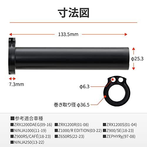 グリップ交換時に邪魔になる突起をなくしたスロットルスリーブ リブを削る必要がなくなり、グリップ交換の作業時間を短縮 推奨グリップ長:貫通グリップ123mm (非貫通グリップは、2-4mm長いグリップを推奨) 参考適合車種:ZRX1200DAEG(09-16)、ZRX1200R(01-08)、ZRX1200S(01-04)、NINJA1000(11-19)、Z1000/R EDITION(03-22)、Z900/SE(18-23)、Z900RS/CAFE(18-23)、Z650RS(22-23)、ゼファー X(97-08)、NINJA250(13-22)