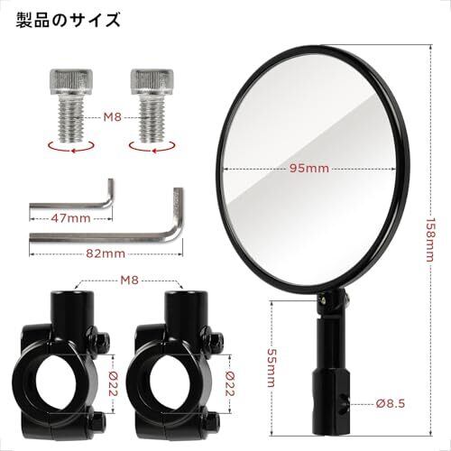 2つの取り付け方法:このバイクミラーは、ハンドルに直接取り付ける方法と、M8ボルトを使用して取り付ける方法の2種類を提供し、さまざまなモデルに簡単に調整できます。 高品質のアルミニウム:このバイクサイドミラーは、耐久性に優れたCNC機械加工されたアルミニウムで作られており、長寿命を保証するとともに、腐食を防ぎ、過酷な条件下でも信頼性の高い性能を提供します。 360°回転可能:バイクハンドルミラーは360°回転可能なデザインで、運転中に鏡を再調整することなく、常に理想的な視界を提供します。 振動の減少:このバーエンドミラーは、ハンドルの振動を最小限に抑えるように設計されており、高速走行中やでこぼこ道でも安定した、クリアな視界を提供します。 クリアな視界:バーエンドミラー バイクは、周囲の車両や障害物を簡単に確認できるクリアな視界を提供し、安全運転をサポートします。