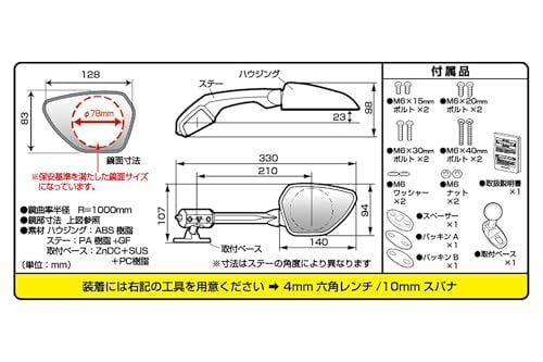 品番:NC-006L/左側専用 材質 :ABS樹脂、PA樹脂+GF、亜鉛ダイキャスト、他 内容:本体×1、ボールジョイント×1、取扱説明書 保安基準:全年式の車両で保安基準適合 装着必要工具:4mm 六角レンチ/10mm スパナ