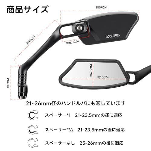 【HD視野+防爆レンズ】弊社の自転車ミラーはステンレス製HDレンズを採用して、平面レンズなので距離感も分かり易く見える景色も自然で良い、リアルなシーンを最大限に反映することができます。また、防爆レンズなので、万一の事故、落下などでのガラス面の破損の際に飛び散りにくい、ライダーの安全を確保できます。 【超広角可視範囲】この自転車バックミラーは、より背の高い人が後方の視線を確認できるように、腕が広がりすぎて視界が遮られないようにしています。自転車ミラーのレンズ面積をアップグレードしました、市販品に比べて、面積が約1.5倍になり、後方の視界が非常に広くなり、更に後方の死角を減らしております。 【360度回転&調節可能】自転車バーエンドミラーは360度回転可能、その上で、横に2.5cm自由移動して視野を広げることも可能です。この機能はより多くのシーン、車種、走行姿勢に対応できる。非常に実用的な機能です。 【安定性/耐久性抜群】高品質素材:ナイロン本体+アルミ合金マウント+ステンレス製防爆レンズ、製品は非常に丈夫で、耐久性があり、破損にくい。背面ねじ調整ロック構造により、しっかりミラーの角度をロックし、走行中も揺れません。アルミ合金マウントの内壁にはスペーサーがあり、自転車を傷つけることはありません。 【取り付け簡単&適用範囲】単個重量僅か126g、六角レンチが付属して取り付け簡単です。自転車バックミラーはどの21~26mm径のハンドルバーにも適しています。ロードバイク、MTB、マウンテンバイク、折りたたみ車、電動自転車、バック、キックボードなどにも使えます。Japan bicycleは、カスタマーに対し、最高水準のカスタマーサービスを提供することをお約束します。 自転車ミラーに関して不満のところがあれば、こちら返金返品の対応ができますので、遠慮せず連絡をお願いいたします。