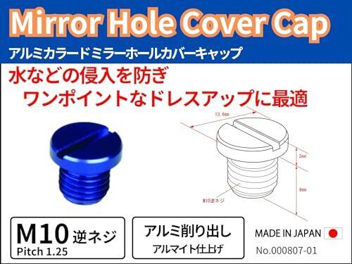 アルミ削り出しのミラー穴埋めキャップ、バーエンドミラー装着時などに使用しなくなったミラー穴を埋めるボルトです。MADE IN JAPAN ハンドル周りのクオリティを高めます。 M10-P1.25 逆ネジ/1個入り アルミ削り出し/アルマイト仕上げ 日本製 ※アルマイト処理時の接点のため根元部に色がのらない箇所がありますのでご了承ください。