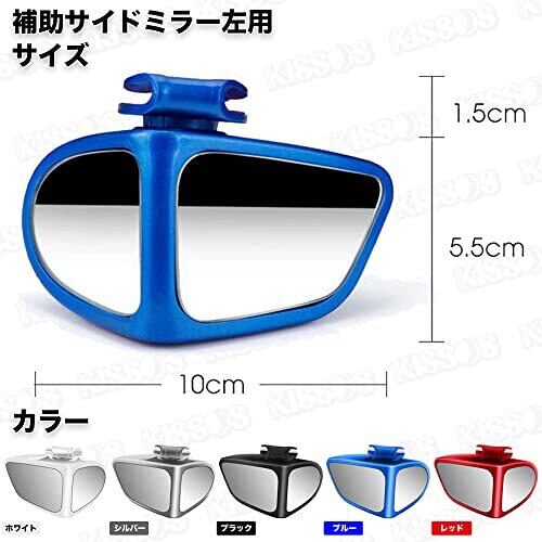 【商品仕様】補助用サイドミラー左用 サイズ:横 10cm 縦 5.5cm 取付部 1.5cm 重さ:約55g 材質:ABS、HDガラス カラー:ブラック・ホワイト・ブルー・レッド・シルバー ※必ず左のミラーにご使用下さいませ。 準装備のサイドミラーや運転席からの目視だけでは見えにくい車両周辺の死角をカバーできる補助ミラー。ドライバーの死角となりやすい斜め後方・下方をとらえることができるサイドアンダー用です。 車のドライバーにとって車体側面の死角は広く、交差点での巻き込み・車線変更時の接触等の原因になっております。補助用サイドミラーにより視野が広がれば危険を回避するのに役立ちます。また駐車時の死角もカバー。後ろのタイヤの位置やバンパーの位置等しっかり後方確認できるので、縁石への乗り上げやホイールの接触等も防止できます。 取り付けは簡単!工具不要ですぐに装着可能です。フックをミラーに挟み込むので、テープとフックでダブル固定。ワンタッチ装着ですがしっかりと固定できる振動に強いブラインドスポットミラーです。 鏡面が上下左右360度可動するので取付け後も微調整が可能。ドライバーがより見やすい角度にこまかく調整することができます。死角を減らし安全運転のサポートにお役立てください。