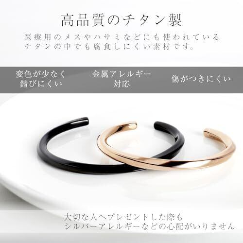 【高品質チタン製・敏感肌にも安心】 医療現場や航空機部品にも使われるチタンを採用し、軽量で錆びにくく変色しにくい特性を備えています。ステンレスより軽く耐久性に優れており、長期間の使用でも美しさを保てます。金属アレルギー対応で敏感肌の方にも安心。普段使いはもちろん、特別なおしゃれにも安心してご着用いただけるペアバングルです。 【シンプルで上品なデザイン】 余計な装飾を省いた洗練フォルムで、普段のカジュアルスタイルからスーツやフォーマルまで幅広く活躍。腕時計やリング、ネックレスなど他のアクセサリーとの相性も抜群です。男女ともに自然に使え、ペアで揃えることで特別感を演出。一人で2本を重ね付けすれば存在感のあるコーデも楽しめます。シンプルながらも洗練された印象を与え、年齢を問わず長くご愛用いただけます。