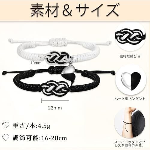【カップルブレスレット】記念日プレゼントは、ハート形はロマンチックな雰囲気に満ちていて、愛の象徴として、それはカップルの間で贈り合う贈り物だけではなくて、お互いの承諾と未来の生活に対するすばらしい祈願です。 【金属アレルギー対応】カップルブレスレットは、調節可能な編み紐は様々な手首周りに快適にフィットします。耐久性があり、日常の摩耗にも簡単に対応します。エレガントで控えめな外観はどんな服にもぴったりです。 【特別なデザイン】結び目バックルは、結び目が注意深く編まれて結ばれていて、愛のペンダントがセットされていて、2つの心の間の強固な関系を象徴して、その耐久性によって、あなた達の愛の強固さを象徴して、より繊細で、より深い愛を追加します!