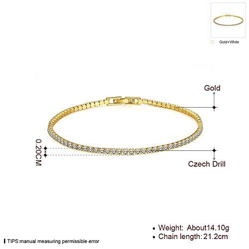 レディースゴールドブレスレットです。素材:ラインストーン ゴールドブレスレット 幅:2㎜ 重量:4.10g 長さ:18cm デザイン:大人の女性にぴったりのサイズ感です 女性には欠かせないキラキラジュエルが輝くオシャレなジュエリー。オーストラリアクリスタルが7粒連なった贅沢なデザインはつけているだけで心躍るような気持ちにしてくれます。 幅6mmのオーストラリアクリスタルを使うことで上品かつ可愛らしいデザインに仕上げました。 華奢なブレスレットは手首周りを女らしくみせてくれますよ。 大人の女性にもピッタリのさりげなく女らしさを与えてくれる魅力的なブレスレットです。