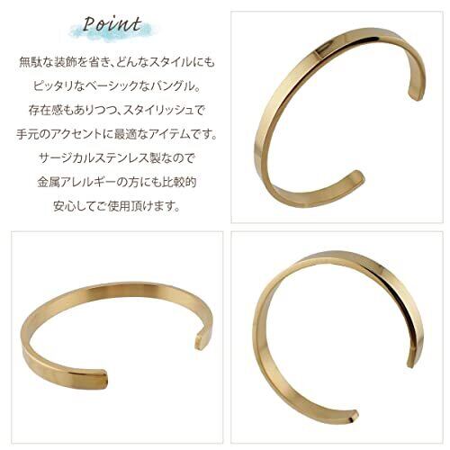 素材:サージカルステンレス製 サイズ:腕周り約17cm、着用口約3cm、厚み約2.5mm、太さ約6.0mm 鏡面仕上げの艶感がポイント! シンプルで使いやすいバングルです。 無駄な装飾を省き、どんなファッションにも合うベーシックなデザイン。 存在感もありつつ、スタイリッシュなバングルは 手元のアクセントにピッタリのアイテムです。 記念日、自分へのご褒美、プレゼント、クリスマス、ホワイトデー、 誕生日の贈り物にピッタリのカジュアルジュエリーです。