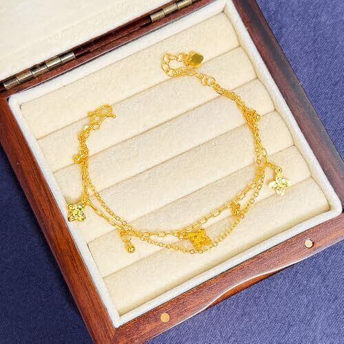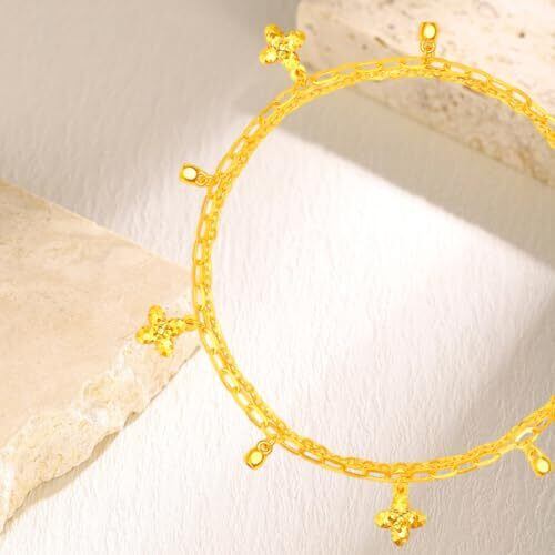 18金 クローバーブレスレット 独自の変色防止・耐摩耗加工を施しています。日々ご愛用いただいても、美しい輝きが長続きします。 シンプルながらもエレガントなチェーンデザインは、どんな装いにも完璧にマッチします。長さ調節可能(16cm~21cm)なので、ブレスレットとして単体で着用したり、他のバングルと重ね付けしたりと、様々なシーンで活躍します。 軽量設計で一日中つけていても負担にならない快適な着け心地。普段使いのカジュアルスタイルから、特別な日の装いまで、様々なシーンで主役になれます。贈り物にも喜ばれます。