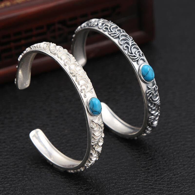 ブレスレット レディース 合金 藤花 彫刻 ターコイズ ブルーストーン アンティーク レトロデザイン 開口 バングル アクセサリー 誕生日 クリスマス プレゼント