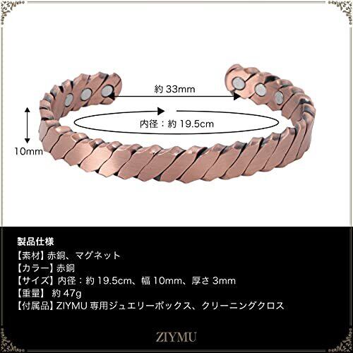 ★赤銅を使った健康オープンバングル。赤銅は銅に金:3%〜5%・銀少量を加えた美しい色彩を放つ高価な合金です。歴史的に装飾品、宝飾品などに利用され、この素材を使う職人の多くは表面に彫刻や装飾を施しました。 ★素材:銅・マグネット ★カラー:赤銅、サイズ: 内径:約19.5cm、幅10mm、厚さ3mm、重量:約 47 g ★付属品:ZIYMU専用ジュエリーボックス、クリーニングクロス ★カジュアルからフォーマルまで幅広いシーンで使えるブレスレットです。プレゼント、記念日、誕生日、結婚式、パーティーなどのドレスアップはもちろん、普段使いのおしゃれにもご使用頂けます。